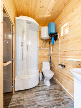 Внутренняя отделка выполнена деревом: комната отдыха отделана под имитацию бруса, остальные помещения вагонка.
