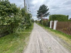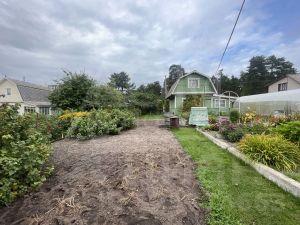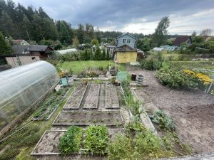 Участок сухой, огорожен забором. На участке: парник, грядки, туи, плодородные деревья и кусты, газон, хоз. блок.