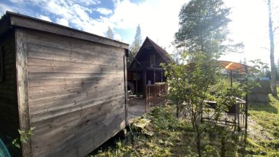 Дом  соединен с ещё одной деревянной площадкой, на которой установлена  крытая купель 2*2 из пластика, углубленная в грунт. БИОтуалет, хозблок и открытый навес для дров. Тоже на сваях.