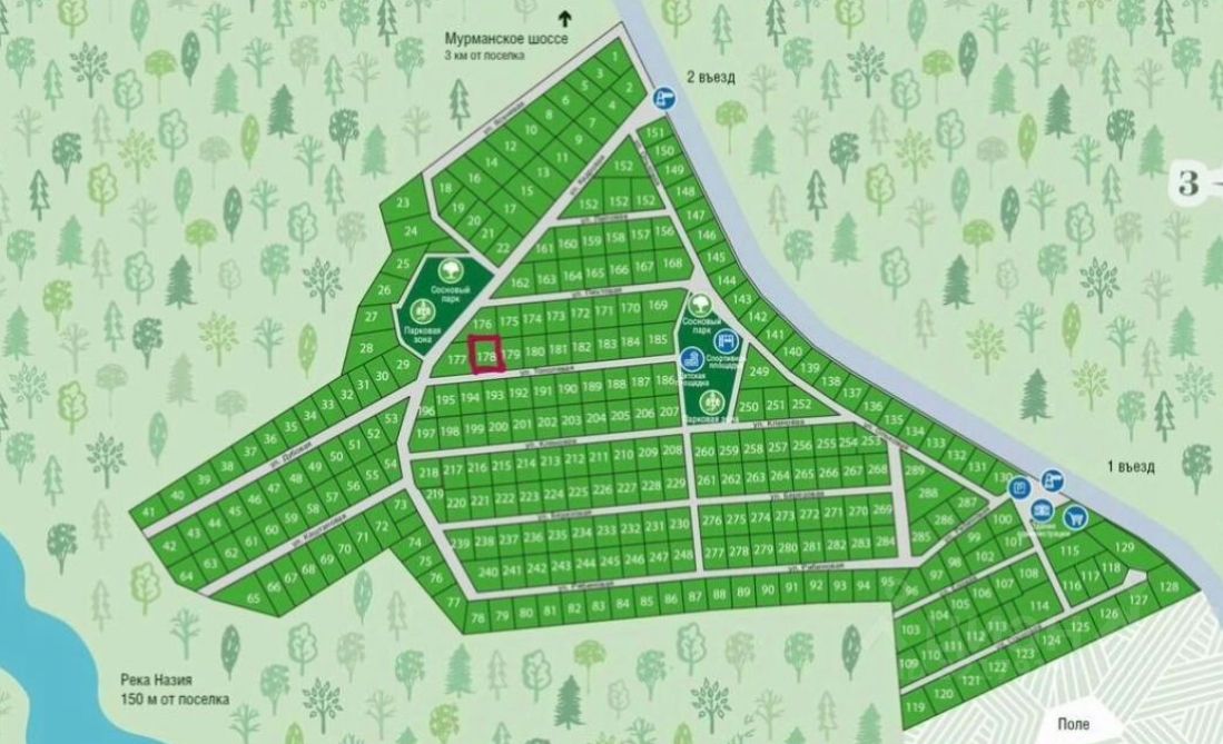 Чистая река Назия, протекающая буквально в 100 метрах от поселка (вот уж где раздолье рыбакам!), озеро "Лесное" для ценителей водных развлечений, и при этом — городской уровень комфорта.