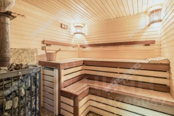 Уютный банный дом включает в себя большую гостиную, сауну и санузел. Он также построен из калиброванного бревна, оснащён газовым котлом.