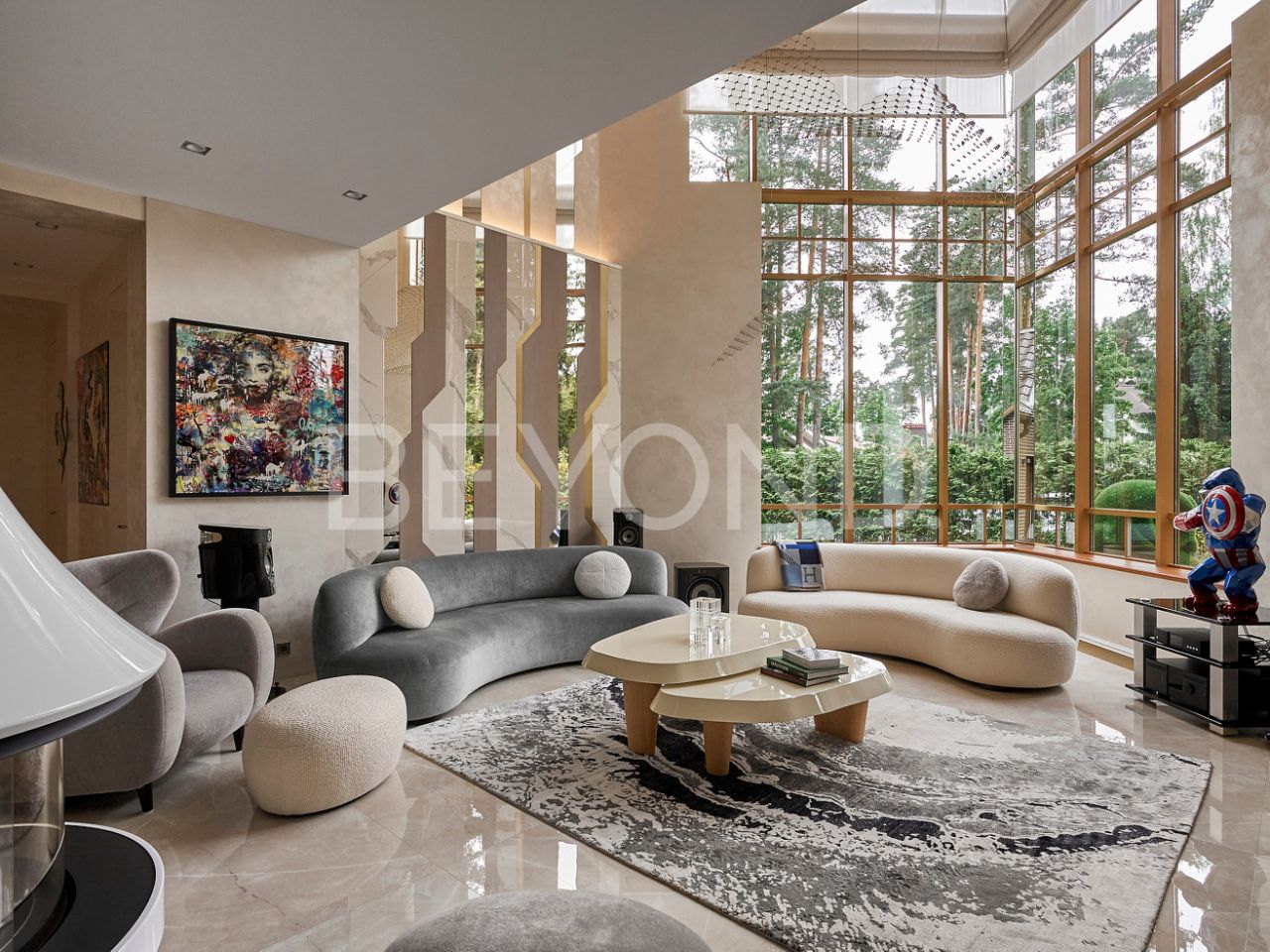 Переступая порог этого дома, вы попадаете в прихожую с большой гардеробной зоной. Справа от входа кухня от известного бренда премиум класса Snaidero. Вся бытовая техника - Gаggеnаu. Уютная столовая с выходом на террасу. На террасе расположен обеденный стол и лаундж-зона. Особого внимания заслуживает гостиная с потолками, устремляющимися ввысь. Панорамные окна словно стирают грань между внутренним пространством и окружающей природой, наполняя помещение воздухом и солнечным светом. Уюта добавляет дровяной камин Воrdеlеt. На первом этаже есть кабинет и комната для гостей.