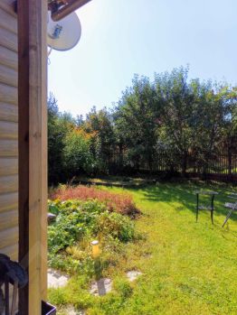 Огороженный участок с ухоженным газоном, по периметру высажены плодовые и декоративные растения, солнечная сторона.