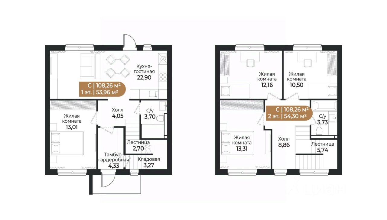 Двухэтажный таунхаус евро-планировки площадью 108.26 кв. м имеет четыре жилые комнаты (10.50, 12.16, 13.01 и 13.31 кв. м), просторную кухню-гостиную (22.90 кв. м), маленькую кладовую и два санузла. Во входной зоне предусмотрено место под небольшую гардеробную зону. Перед входом в дом есть 2 парковочных места, а на заднем дворе собственное патио площадью 146.7-366.7 кв. м, где можно организовать площадку для отдыха или барбекю. Внутренняя отделка Таунхаус сдается с полной чистовой отделкой и готовой кухней. В основе дизайн-концепции лежат идеи скандинавского минимализма. Светлые природные оттенки подойдут для воплощения большинства интерьерных идей. В отделке использован износостойкий ламинат 32 класса с древесной фактурой, белые матовые флизелиновые обои под покраску, плинтуса в цвет стен, белые матовые натяжные потолки с креплением под люстру и встроенными спотами, межкомнатные двери из МДФ с черной фурнитурой. В санузлах крупная керамическая плитка с мраморным узором на стенах и серая на полу; унитаз с инсталляцией, белая раковина со смесителем, белая акриловая ванна с экраном. Предусмотрено место для подключения стиральной машины. Кухонный гарнитур спроектирован по индивидуальным параметрам. Корпус и нижний фасад светлого оттенка дуба, а верхний фасад белого цвета. Во внутреннем оснащении есть лоток для столовых приборов и двухуровневая сушилка для посуды. Кухня укомплектована встроенной техникой: 4-конфорочная электрическая варочная поверхность, электрический духовой шкаф, вытяжка, посудомоечная машина, встроенная композитная мойка и смеситель с аэратором. Внешняя отделка Фасад выполнен из трехслойных железобетонных стеновых панелей по монолитной технологии. Поверхность наружного слоя из архитектурного бетона имитирует текстуру и цвет деревянных реек и досок, а также кирпича. Расположение и инфраструктура Жилой комплекс "СветЛО" располагается в районе с экологически чистом районе. Он окружен лесами, озерами и заповедниками. На закрытой охраняемой территории свой коммерческий кластер с пунктами выдачи, коворкингом, кафе и ресторанами, магазинами, фитнес-центром; променад длиной 1.5 км, пруд с набережной и пляжной зоной, сухой фонтан, уличные тренажеры, детские площадки, парк для выгула собак. Социальная инфраструктура включает детский сад на 140 мест и общественные прогулочные зоны японский сад и сад трав.