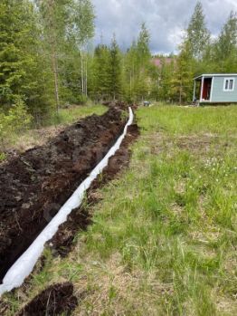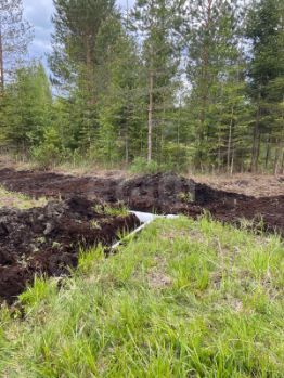 Участок очищен, осушен. Сделан дренаж - 3 трубы уложены по участку. Воды на участке нет даже весной.На участке растут сосны и ели.