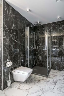 •На 1 этаже — турецкий керамогранит большого формата, включая стены санузлов.