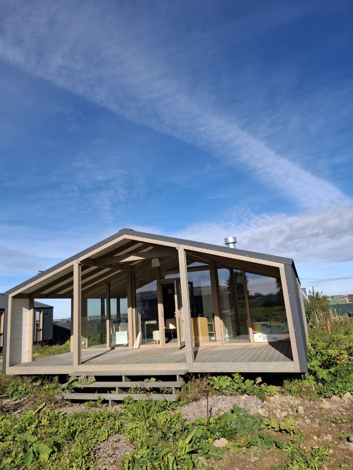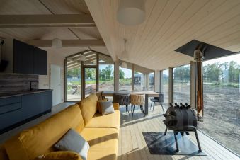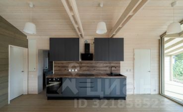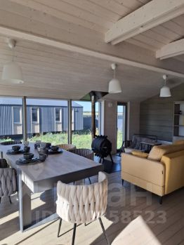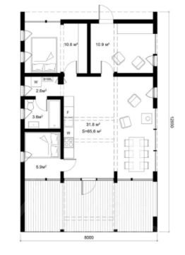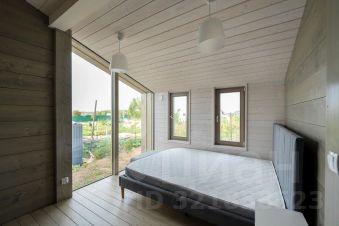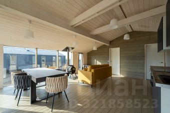 Просторная кухня-гостиная 31,8 кв.м., две спальни по 10,8, комната 5,9 кв.м., санузел с ванной. Большая терраса 25 кв.м. Панорамные окна обеспечивают максимальное естественное освещение в доме.