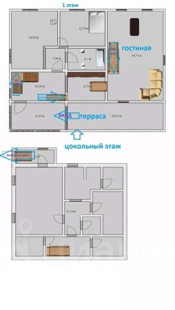 Цокольный этаж оборудован гаражом, комнатой длят хранения продуктов, котельной и другими хозяйственными помещениями.