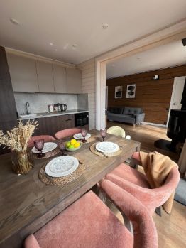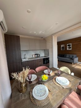 На 8 сотках расположен уютный дом с двумя спальнями, просторной кухней-гостиной и террассой. В спальне большая двуспальная кровать с подъемным механизмом и две вместительные прикроватные тумбы. Вторая спальня оборудована под детскую с эффектным шкафом. В прихожей интегрирован огромный шкаф длинной 2 метра и глубиной 60 см. В гостиной есть выдвижной экран с проектором для атмосферных киновечеров и современный раздвижной диван-кровать. На кухней есть все необходимое для комфортной готовки и хранения продуктов: встроенный 2х камерный холодильник, посудомоечная машина, духовка со встроенной микроволновой печью, индукционная варочная поверхность. Проводить семейные обеды Вы сможете за трансформируемым столом из массива. В ванной есть большой встроенный душ с трапом. Дом очень светлый, во всех помещениях большие панорамные окна в пол.