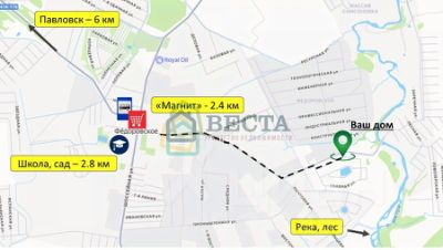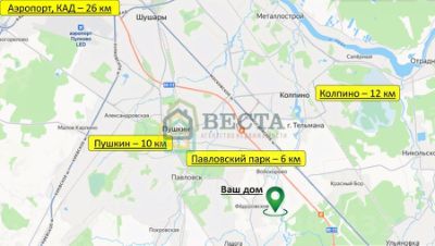 Вся необходимая инфраструктура г. Павловска - в 6 км и пос. Фёдоровское - в 2,5 км - школа, детский сад, банки, почта, рядом - сетевые магазины, кофейня. В 500 метрах - р. Ижора, с возможностью рыбалки и хвойный лес в 1.5 км. 12 км до г. Колпино. Всего в 15 мин. на авто - дворцы и парки Пушкина и Павловска.