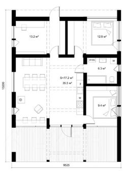 Кухня-гостиная 35,5 кв.м. с панорамным остеклением и выходом на большую террасу, три комнаты 13,2 кв.м., 12,8 кв.м. и 9,4 кв.м., санузел с ванной.
