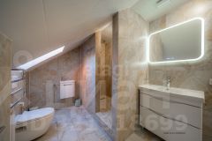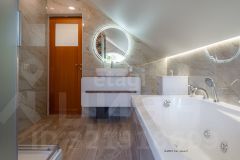 Фундамент дома ленточный заглубленный из фундаментных блоков ФБС с армированным поясом, гидроизоляцией и утеплением. Конструкция несущих стен газобетонные блоки 400 мм с утеплением 150 мм и облицовкой кирпичом. Межэтажные перекрытия - бетонные плиты. Межкомнатные перегородки выполнены из кирпича толщиной 250 мм с утеплением и обивкой гипсокартоном, что обеспечивает отличную шумоизоляцию. Дом оборудован системой вытяжной вентиляции. Кровля двухскатная с покрытием финской металлочерепицей и оборудованная снегозадержателями. Дом имеет застекленную террасу с ИК отоплением, а также два отдельных входа с металлическими дверями. Коттедж меблированный и оборудован всей бытовой техникой для комфортного проживания.