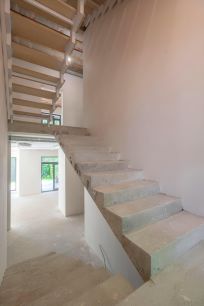 Внутренняя штукатурка стен сделана под маяки. Лестничные марши - с 1-го на 2-ой этаж монолитный, со 2-го на 3-ой этаж металокаркас из профильной трубы 100*50, 50*25