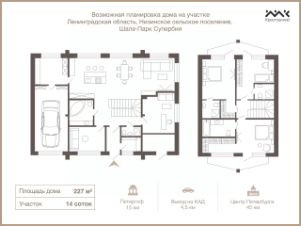 Общая используемая площадь дома составляет 259 м² с балконами и входными зонами. Тёплый контур — 227 м², второй этаж — 77 м². В планировке предусмотрен гараж 25 м², интегрированный в архитектуру дома.