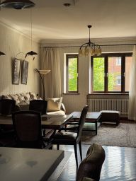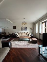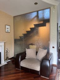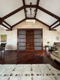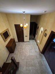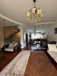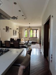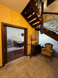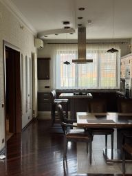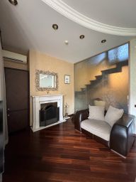 Первый этаж - прихожая, холл, санузел первого этажа и просторная комната, площадью порядка 50 метров, разделенная на кухонную зону с островом, столовую зону и гостиную зону с установленным диваном, креслом и камином. Также из первого этажа выход во внутренний двор. Установлены роллеты на ПУ (двери и окна на сторону внутреннего двора). На полу паркет. В санузле плитка. Полы с подогревом в санузле и кухонной зоне, где на полу плитка.