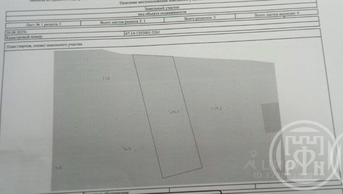 Ленинградская область Ломоносовский район, Ропшинское сельское поселение. терр.Горная поляна - 2, улица УДАЧНАЯ,продается земельный участок 820 кв.м -категория земель--земли сельхозназначения, разрешенное использование-. ведение садоводства. 10 минут пешком до п.Ропша, рядом с д. Михайловская, размер участка - 20Х40, кадастровый номер 47:14:1203001: 5262. Прямая продажа
