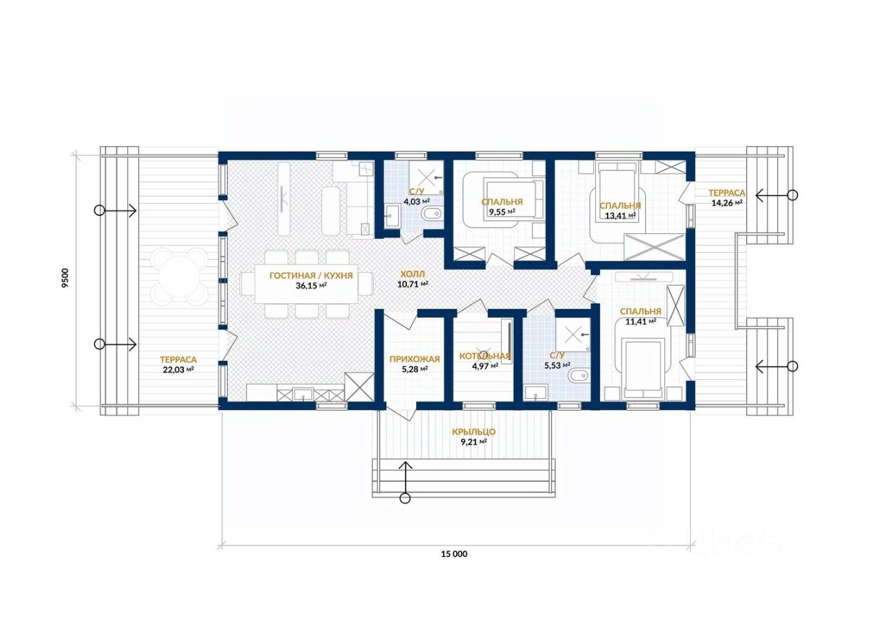 — Планировка: 3 спальни, 2 санузла, терраса.