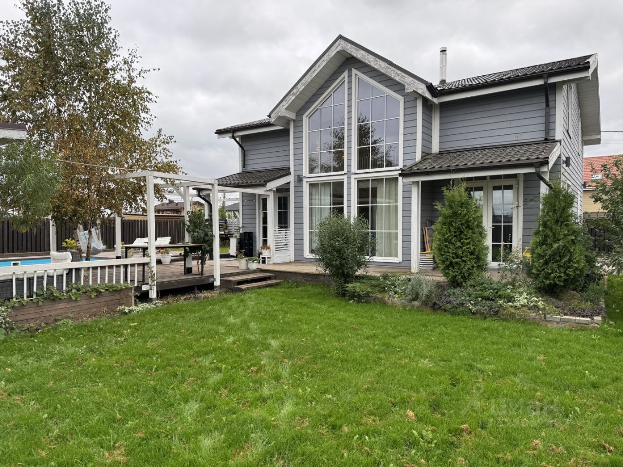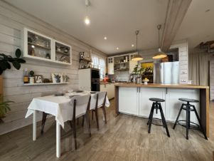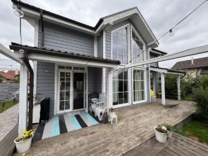 О доме: каркасный дом, построенный по индивидуальному проекту, имеет высокие потолки в кухне-гостиной, а также террасу обращенную во внутренний двор; кухню со всей необходимой техникой включая большую посудомоечную машину (ширина 60 см) и выделенный остров.