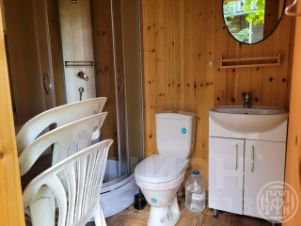 На территории участка расположен внешний деревянный санузел, который оборудован душевой кабиной, стиральной машиной и бойлером.