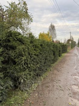 Вдоль забора высажены ухоженные и выстриженные карельские если которые являются живой красивой изгородью скрывающей участок от любопытных глаз прохожих и защищающей от пыли с дороги.