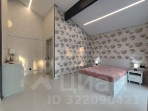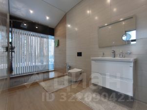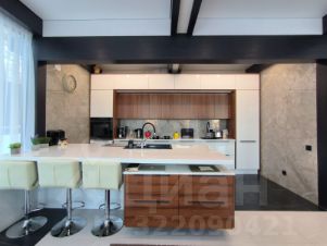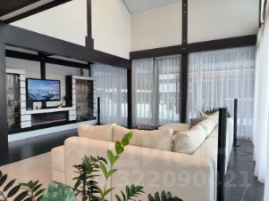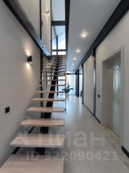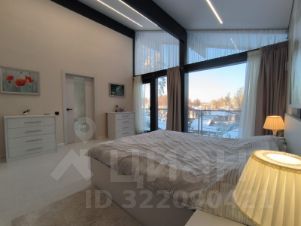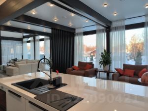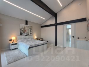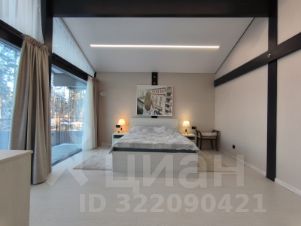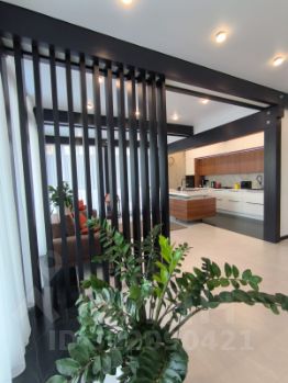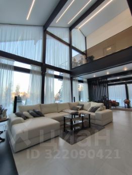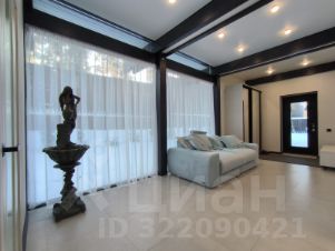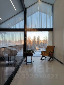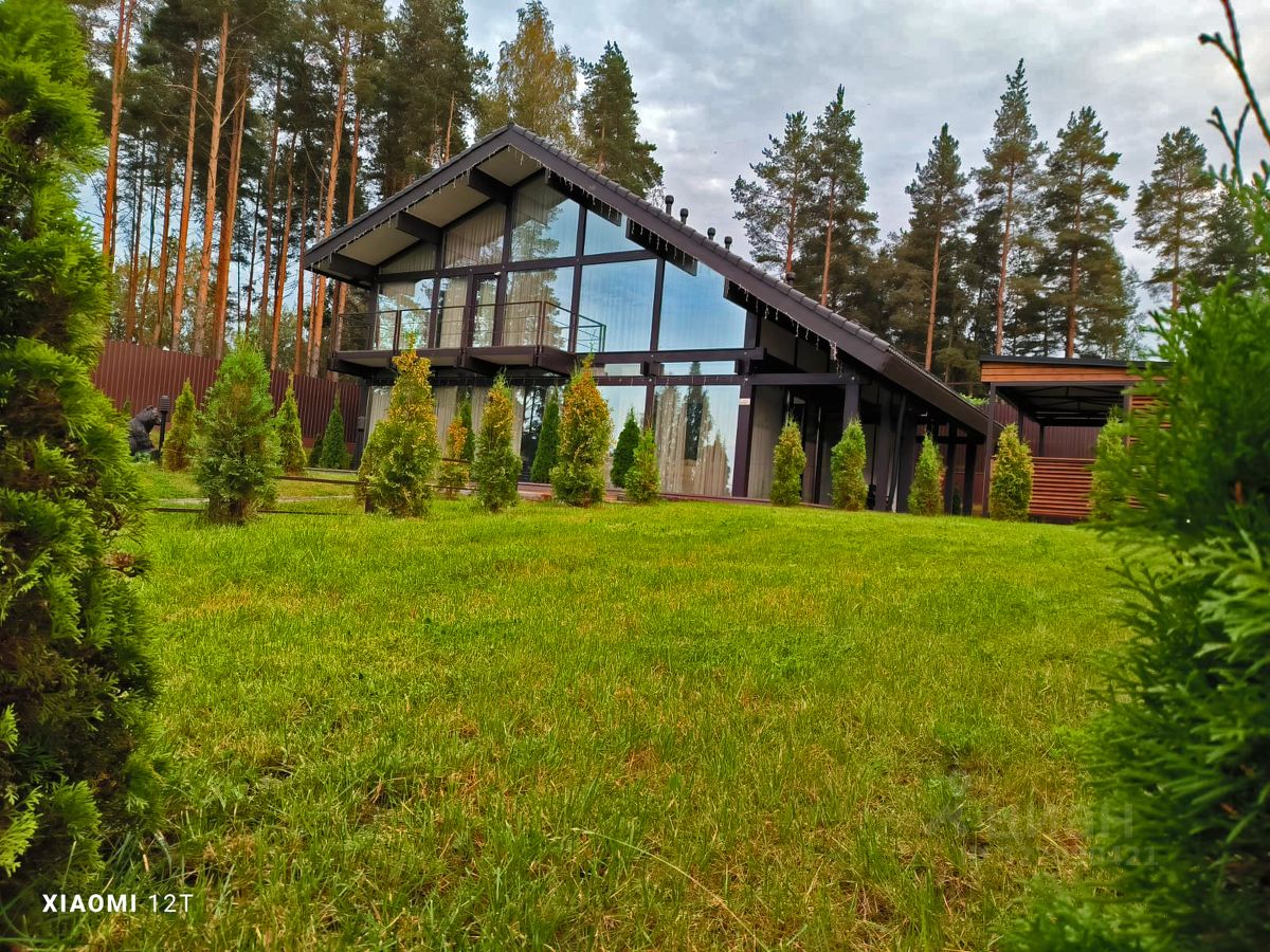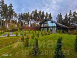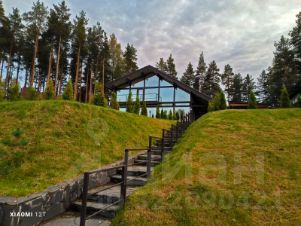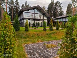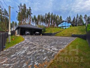 Дом очень светлый и просторный благодаря панорамному остеклению. Ухоженный и огороженный участок ступенчатого вида с газоном, высажены туи, мощеные дорожки и статуя медведя на камнях. Дом находится на возвышенности участка.