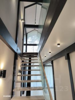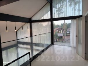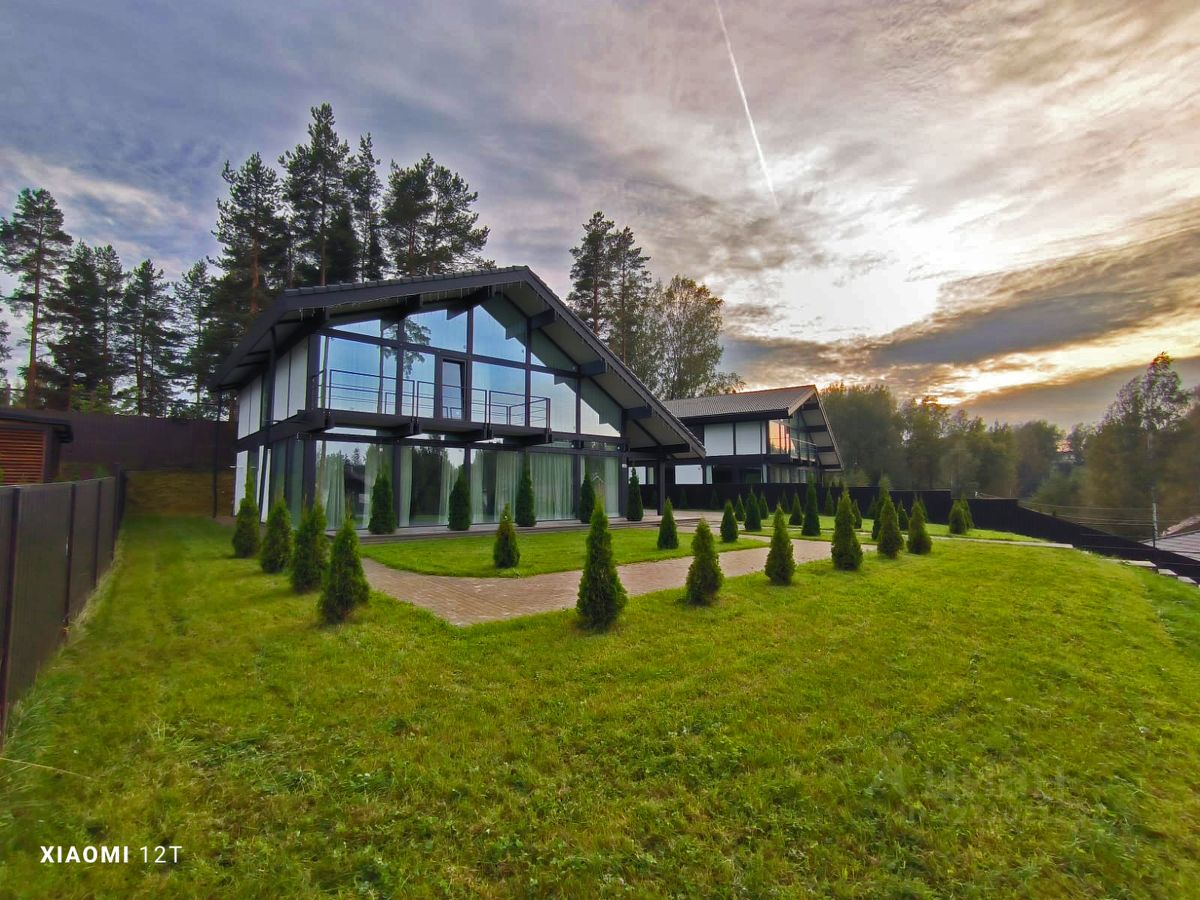 Дом очень светлый и просторный благодаря панорамному остеклению. Ухоженный и огороженный участок ступенчатого вида с газоном, высажены туи, мощеные дорожки. Дом находится на возвышенности участка.