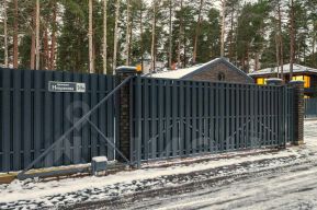 Установлен забор из евроштакетника с откатными воротами на пульте.