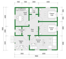 - Кухня 12 кв.м., 3 комнаты (18+12+12), терраса 9 кв.м (3х3 м);