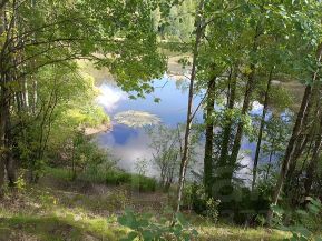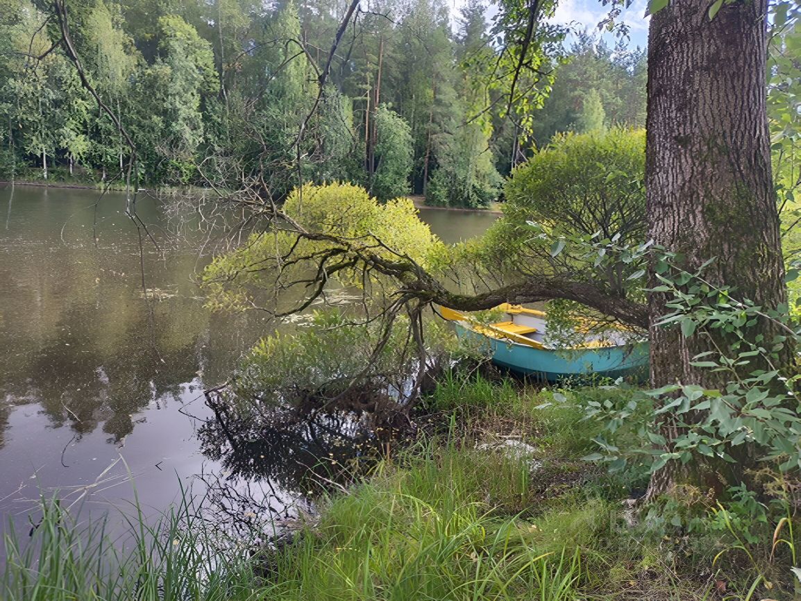 По границе участка проходит лесополоса, до озера 4 минуты пешком по тропинке с участка. На озере организован глэмпинг и пляж.