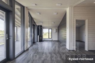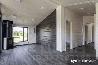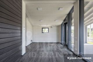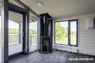 • Просторная гостиная с дровяным камином, объединённая с кухней (21,5 м²). Благодаря панорамному остеклению открывается прекрасный вид на участок. Из гостиной есть выход на благоустроенную террасу, где можно проводить летние вечера в кругу семьи и друзей.