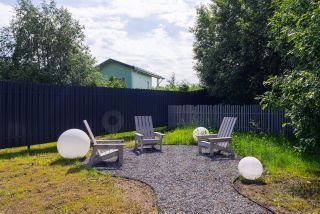 На участке площадью 7,2 сотки сформирован красивый рельеф, проложены дорожки и засеян газон. Организованы зоны отдыха с креслами, установлено уличное освещение, предусмотрена парковка на два автомобиля. По периметру — европейский забор, соответствующий архитектурной концепции посёлка.