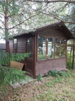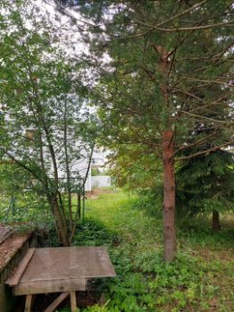 На территории находится беседка, место для огорода, фундамент и небольшой крытый домик.