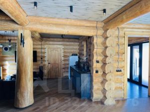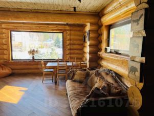 Гостевой дом с баней и террасой: бревенчатый коттедж из архангельской сосны с покрытием защитным лаком. Фундамент - плита на сваях