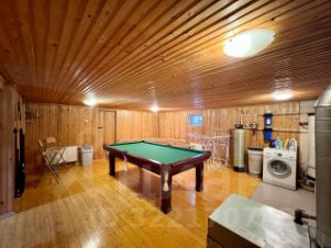 В цокольном этаже большой зал , в котором можно даже играть на бильярде, котел , санузел цокольного этажа, спортивная комната.