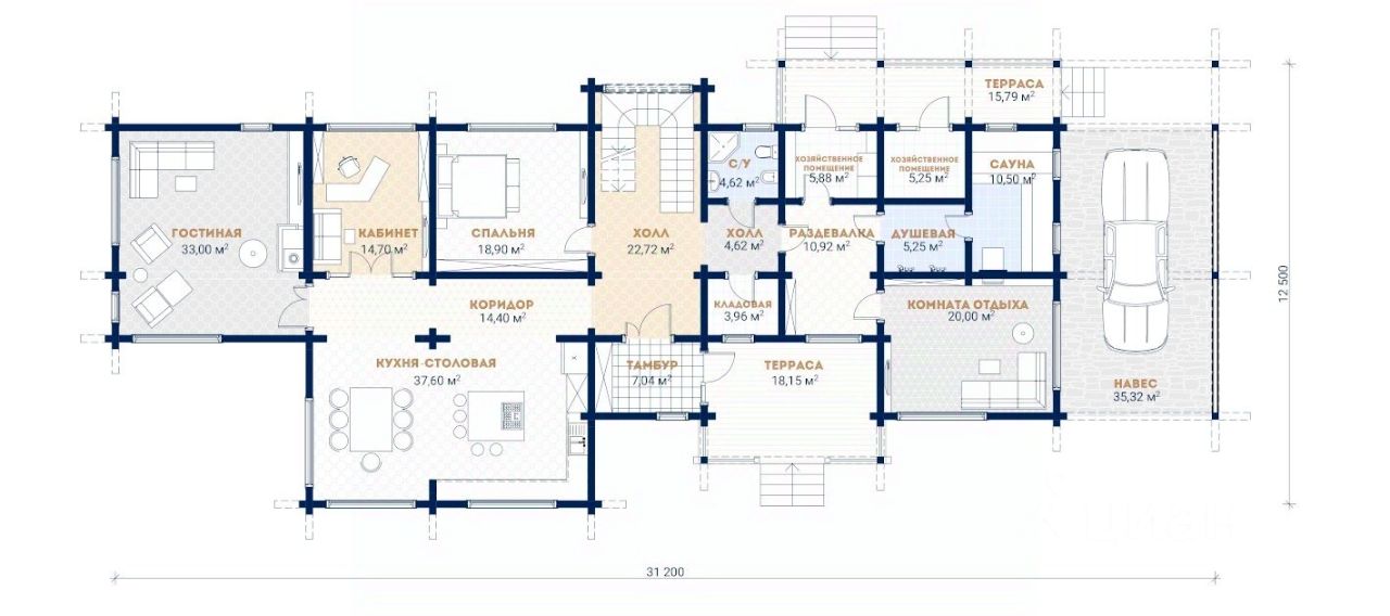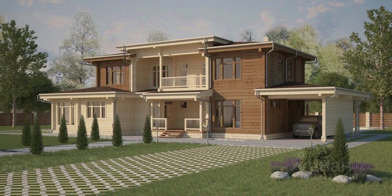 — Планировки: 2 этажа, 4 спальни, 4 санузла, кухня-столовая, отдельная гостиная, кабинет, сауна с комнатой отдыха, навес для автомобиля.