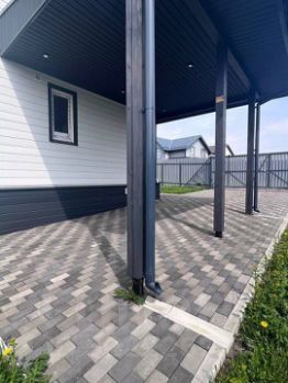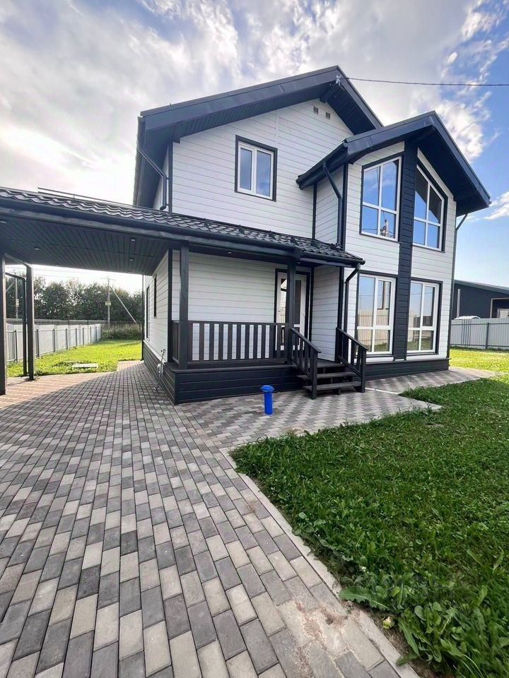 Парковочная зона и отмостка по периметру коттеджа вымощена плиткой. Ворота (автоматика), забор из металлопрофиля смонтирован по периметру участка. Коттедж площадью 135 м кв построен по каркасной технологии из сухой доски.