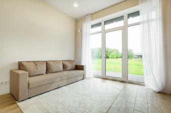 - Кухня-гостиная 21 м² с панорамным остеклением и выходом на террасу 9,7 м²