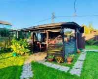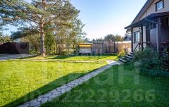Территория полностью благоустроена и демонстрирует образцовый порядок. Участок включает огороженный заезд на две машины с воротами, большую остекленную беседку, функциональную мангальную зону с хозблоком, ухоженный газон, цветники и плодовые деревья.