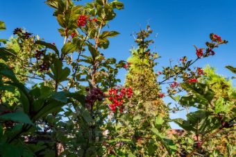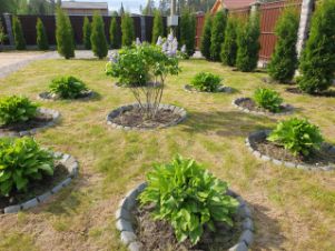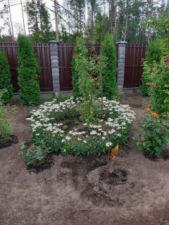 -на участке высажены 80 туй,привозились на заказ, от 3 метров и выше, 10 самшитов, декоративные растения, розы.