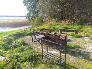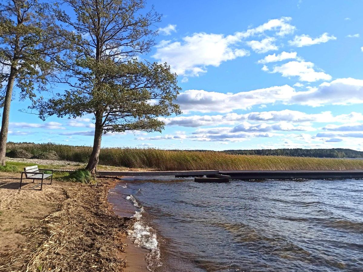 Оборудованная береговая линия, пирс со ступенями, пляж, зона отдыха с мангалом, качели, скамейки, детская площадка, место для хранения лодок.