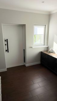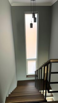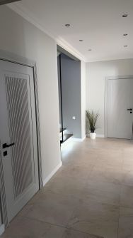 Внутри дома качественная отделка: керамогранит , влагостойкий ламинат , лестница с подсветкой . Дорогие межкомнатные двери .
