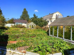 Плодовые деревья, можевельник, малина, много грядок с клубникой, черная, красная смородина, крыжовник.