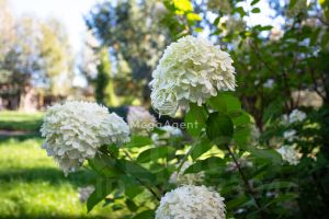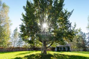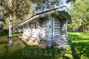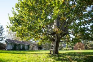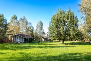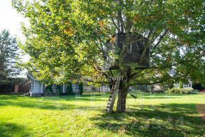 - На участке с ландшафтным дизайном баня, домик на дереве для детей и хозяйственная постройка