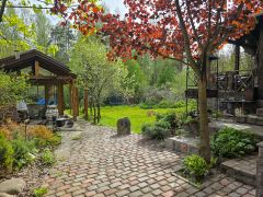 Сделан ландшафтный дизайн, освещение, мощение. По периметру высокий забор.