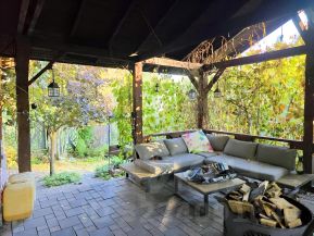 Первый этаж: гараж на несколько авто и под хранение, в гараже была котельная, кухня, раздельный с/у, столовая-гостиная со сдвижным остеклением, комната с камином, две спальни, винный погреб, крытая терраса.