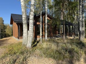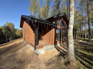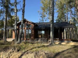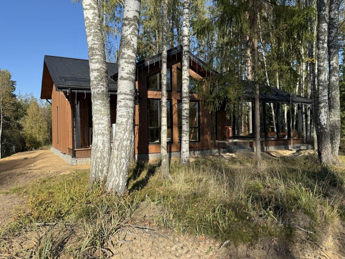 Современный дом в сосновом лесу готов к заселению. Вас ждёт панорамное остекление и просторная терраса с видом на лес. Все инженерные коммуникации уже подведены.