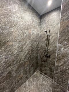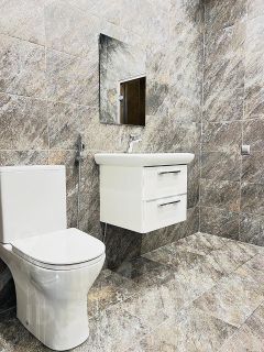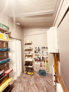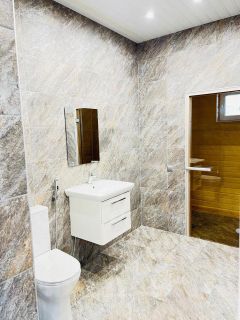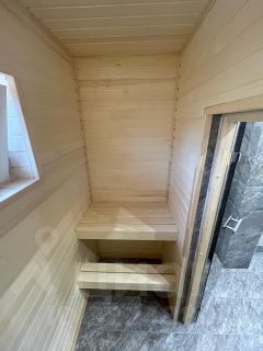 керамогранит на стенах до потолка. В санузлах - реечный металлический потолок. Электроснабжение - 15 кВт. Канализация - локальная, пластиковый септик с переливным колодцем и полем фильтрации. Земельный участок 11 соток по всему периметру огорожен забором типа ранчо с откатными воротами. С фасадной стороны дома - площадка из тротуарной плитки для удобной парковки нескольких автомобилей и возможностью установить кадки для вечнозеленых растений. С тыльной стороны дома газон, установлена дренажная система. На участке построен технический блок 20 кв метров. Стены - пенобетон, облицовка - декоративный кирпич серого цвета. Фундамент - монолитная плита 300 мм. Внутри блока расположена водяная скважина глубиной 20 метров.