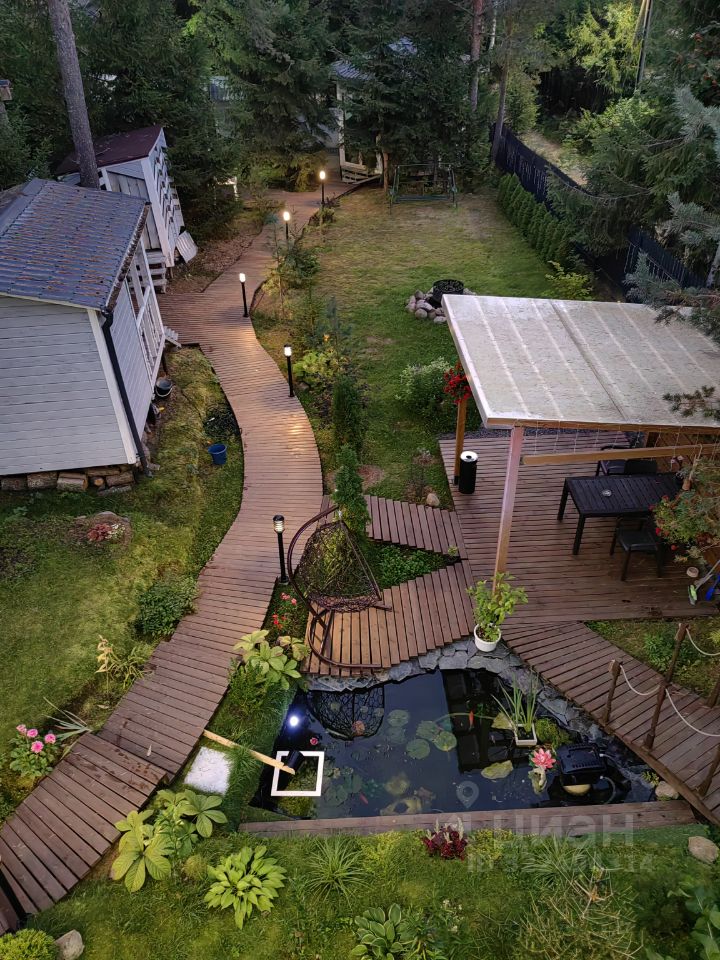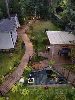 Загородный дом среди сосен с небольшим прудом и золотыми рыбками.