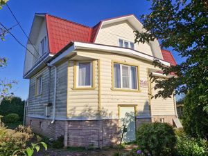 В старинной деревне Гатчинского района отличный 2-этажный коттедж 10,6х6,7м (бревно + утеплитель + блокхаус) с полноценным цокольным этажом и двумя пристройками: 2-этажным утепленным солнечным эркером и закрытой верандой.