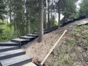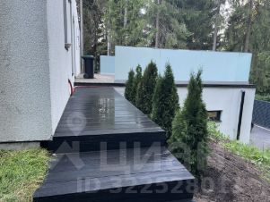 Дом расположен на естественном холме участка, есть подъем по лестнице. Въездная зона из брусчатки, откатные ворота и отдельная калитка для входа, есть бетонированная площадка для установки бытовки.